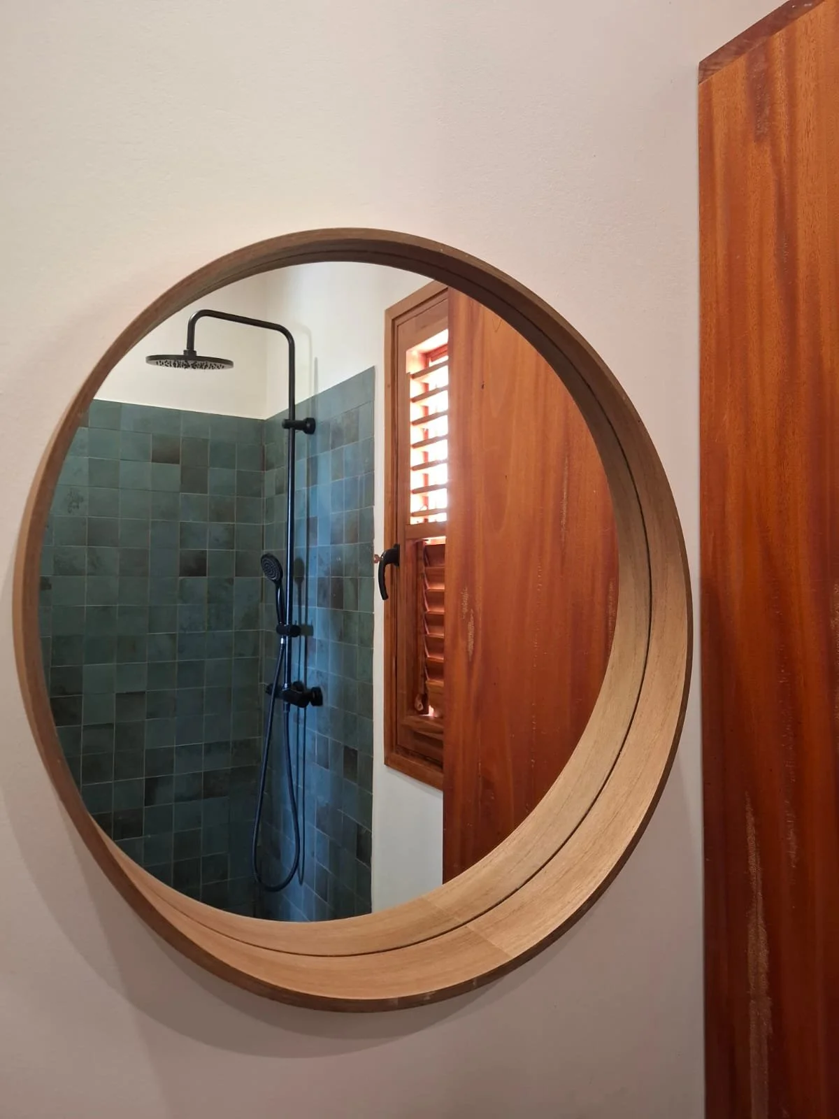 Les chambres intègrent des persiennes en bois, éléments essentiels de l’architecture tropicale, qui favorisent la ventilation naturelle tout en préservant l’intimité. Elles participent à cette respiration permanente de la maison, entre ombre, lumière et circulation de l’air.